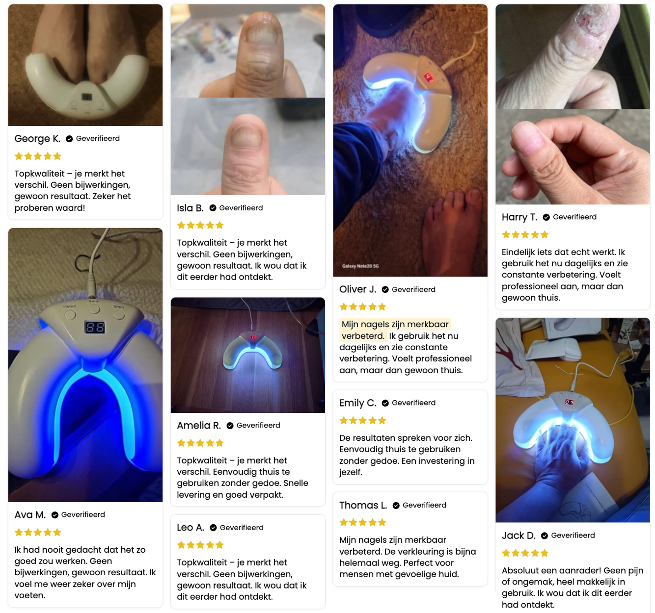 Nu kan ik vol vertrouwen zeggen dat mijn nagels gezonder zijn dan ze in jaren zijn geweest. Ik vrees niet meer het aantrekken van schoenen of het tonen van mijn voeten in het openbaar. Dit apparaat heeft mijn nagelgezondheid echt getransformeerd, en ik kan niet gelukkiger zijn.”